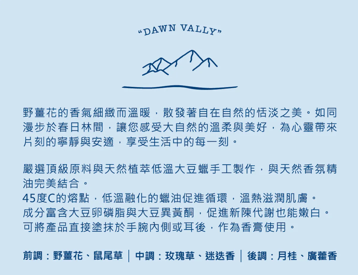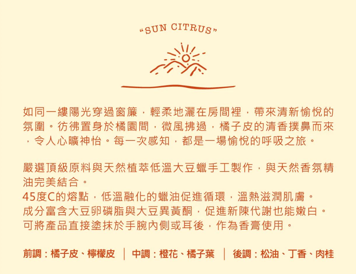 品 名:香氛乳液蠟燭_日橙、曦谷、月松(本產品附全新包裝紙盒與說明小卡)