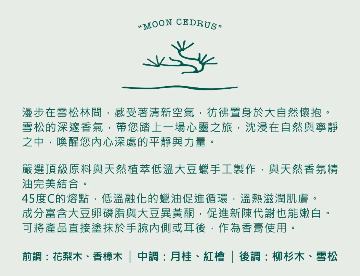 全成分:天然精油、天然大豆蠟、精製白蜜蠟、天然桂竹杯、有機木芯。